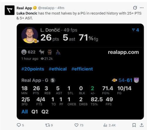 东契奇半场拿到25+5助攻,他已经是有数据记录后控球后卫中最多25分+5助攻的球员。