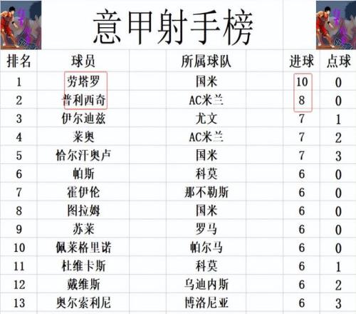 射手榜方面,前十没有变化,劳塔罗10球领跑,普利西奇8球紧随其后。伊尔迪兹,莱奥和恰尔汗奥卢7球并列第3,图拉姆今天未能进球,还是和苏莱,奥尔索里尼等人6球刚好挤入前十。